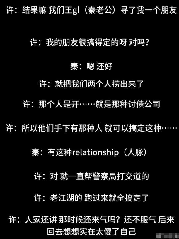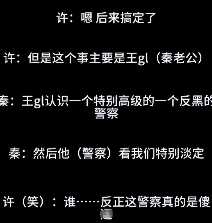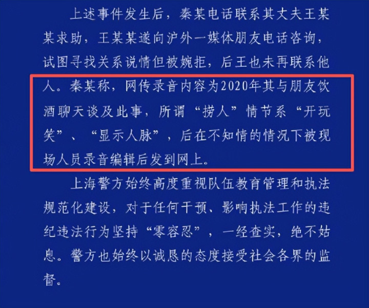 这次事件发酵后,警察找到秦雯询问当时具体细节,她承认录音的内容只是醉酒后的一次“吹牛”而已,没想到在不知情的情况下,被人录制成音频发布到网上了。