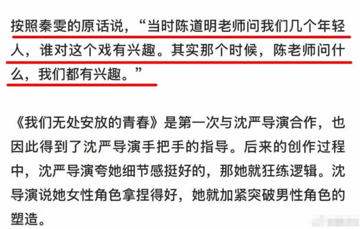 当年可是陈道明带着秦雯走到这一行的,还让她参与《无处安放的青春》这部剧的创作。