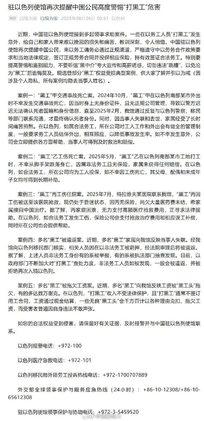 [#近期多名中国公民在以色列失联#]#驻以色列使馆接到多起领事求助案件#8月26日,驻以色列使馆发文:近期,中国驻以色列使馆接到多起领事求助案件。一些在以务工人员“打黑工”发生意外,给自己和家人带来难以挽回的损失和痛苦,教训深刻,令人惋惜。